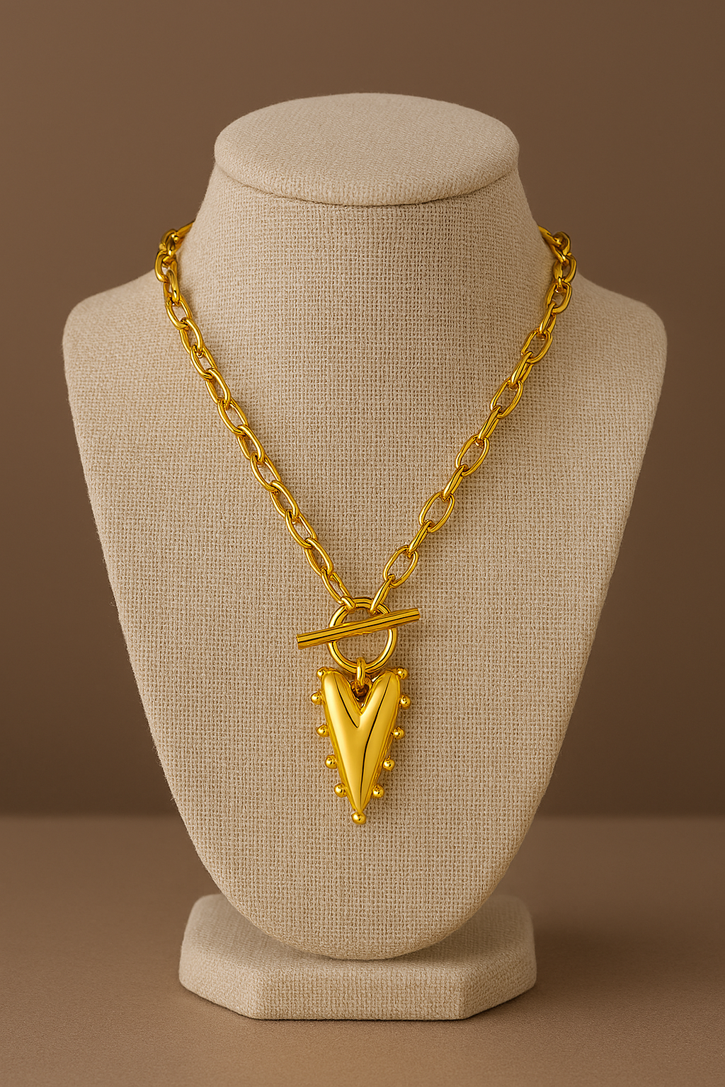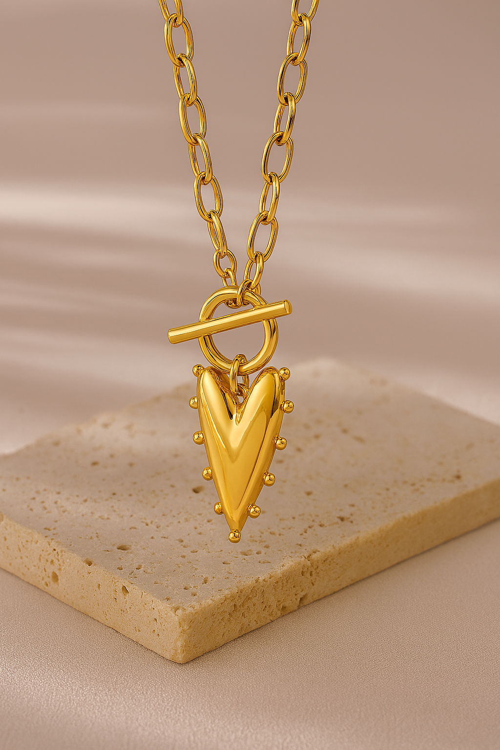 El Avanti Chain es una expresión de amor moderno y sofisticación atemporal. Este collar dorado presenta un dije en forma de corazón, delicadamente contorneado con esferas pulidas que aportan textura y brillo. El diseño se complementa con un cierre tipo barra (toggle) al frente, que añade un toque distintivo y facilita su colocación.