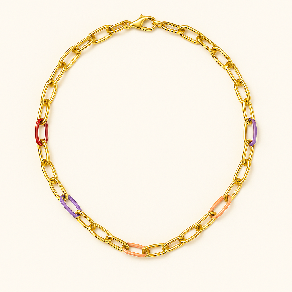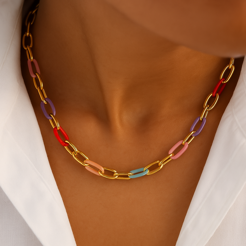 Dale un toque vibrante a tu estilo con el collar Color Necklace. Diseñado en acero inoxidable de alta calidad, este accesorio no solo destaca por su acabado moderno y colorido, sino también por su resistencia al agua, ideal para acompañarte en cada momento sin perder su brillo ni su esencia.