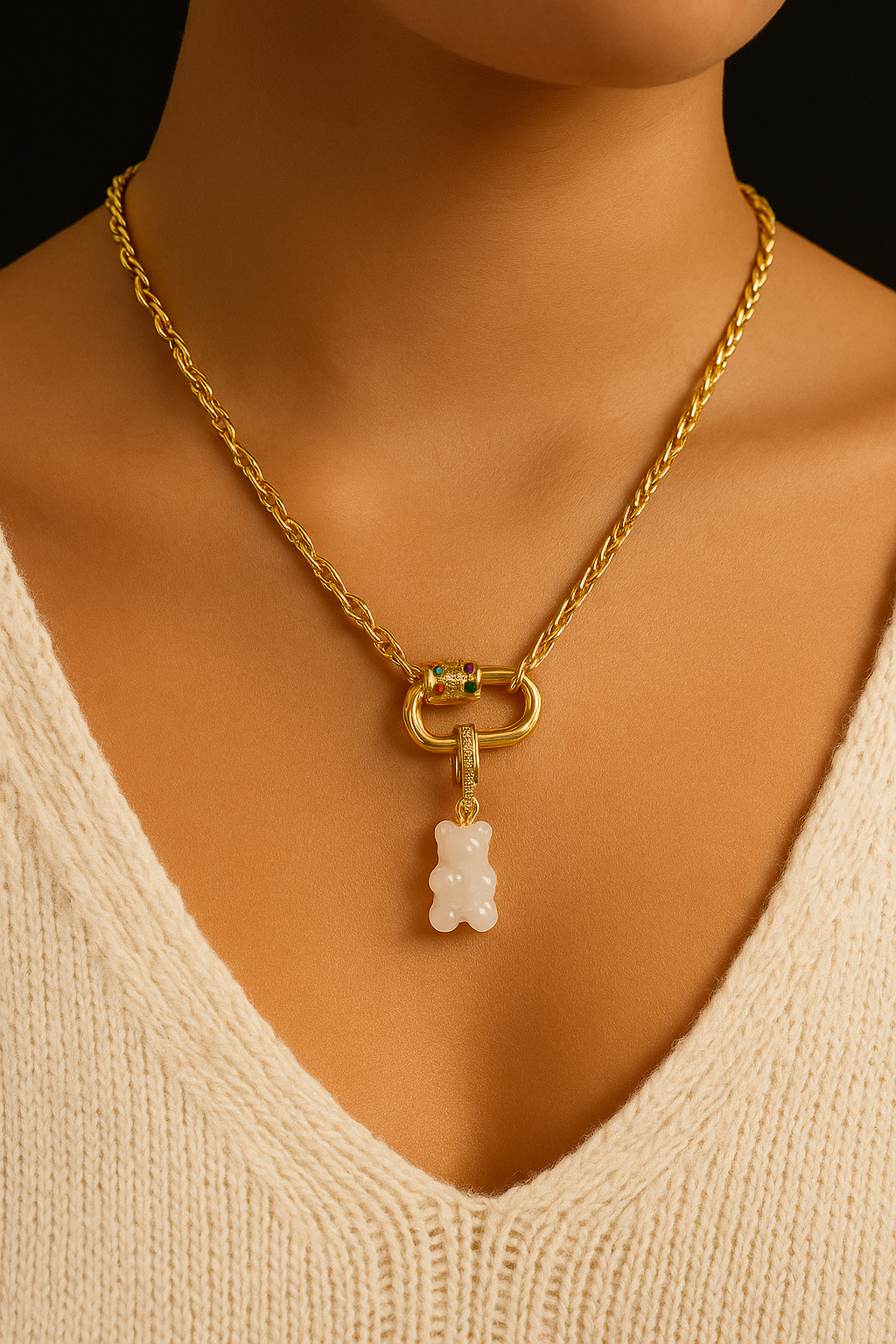El Custom Jelly Bear Necklace es el accesorio perfecto para quienes aman los detalles divertidos y elegantes. Su diseño único con un adorable dije en forma de osito de goma, combinado con una cadena de acabado dorado de alta calidad, lo convierte en una pieza moderna y llamativa. Además, es resistente al agua, lo que te permite lucirlo con confianza todos los días.