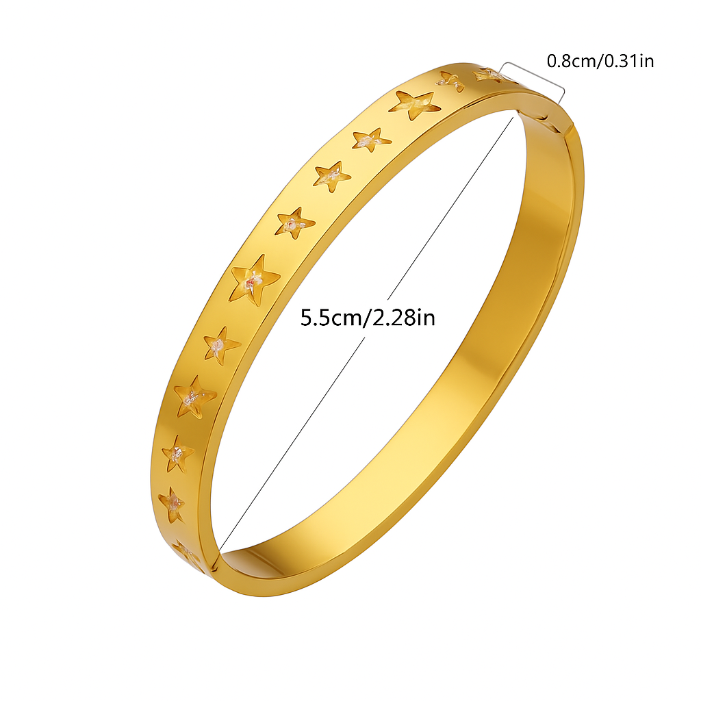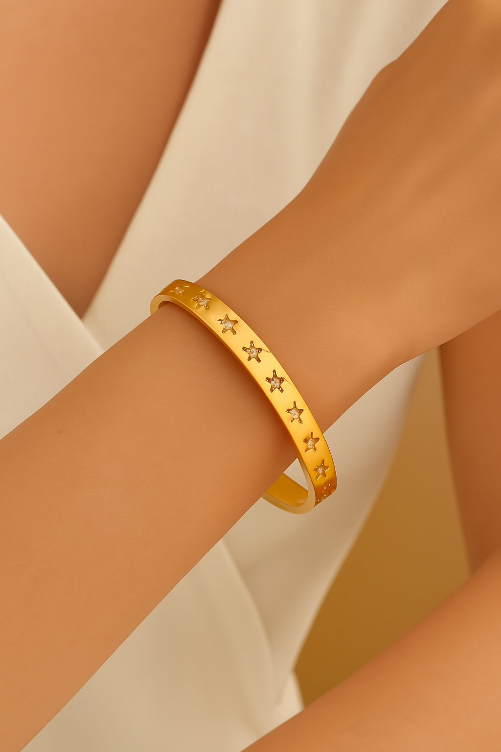 Estrellada Bangle Una oda al brillo celestial en forma de brazalete. El Estrellada Bangle está diseñado para quienes llevan luz propia—una pieza dorada adornada con delicados detalles estrellados que evocan noches mágicas y sueños por alcanzar.