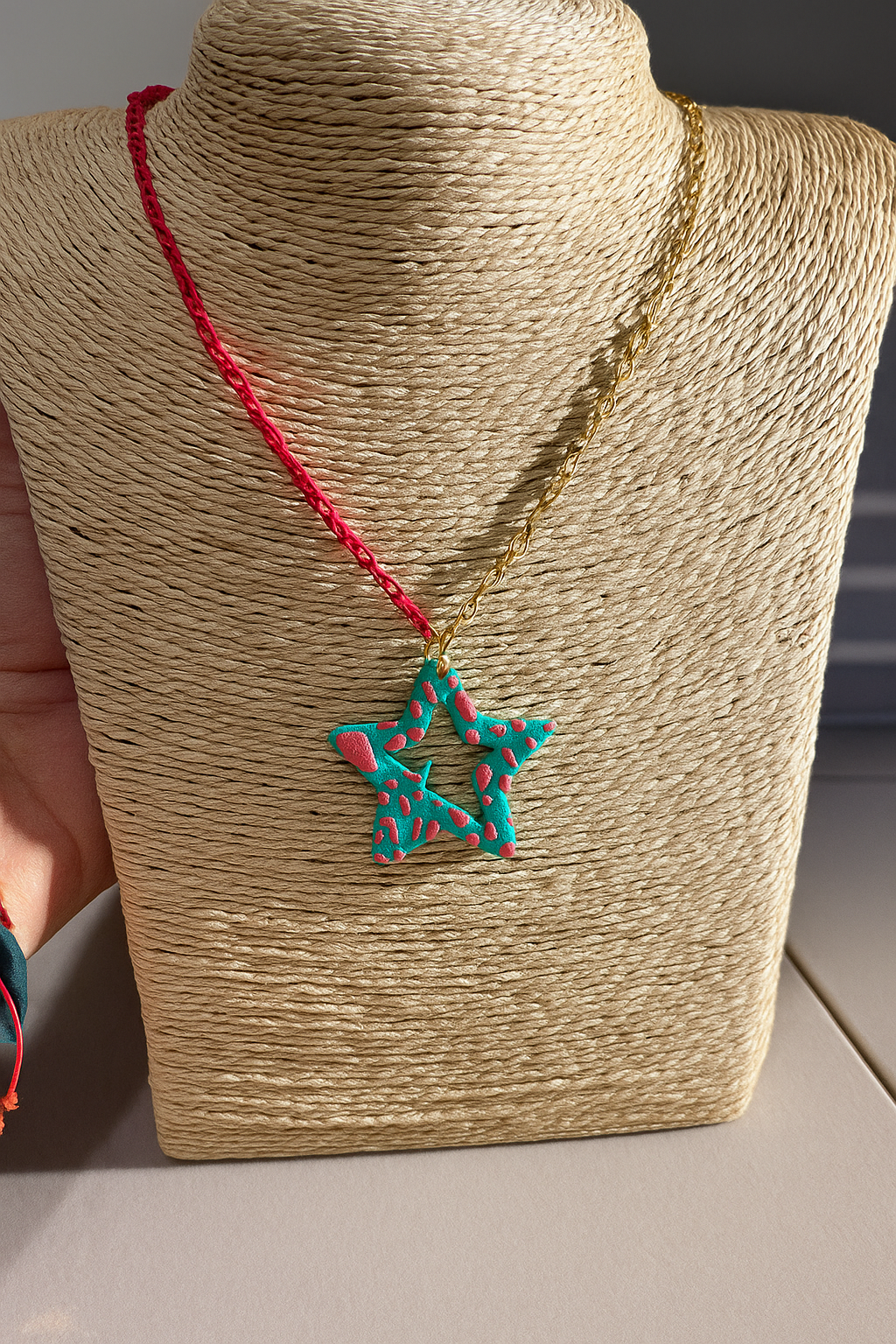 Atrévete a destacar con el collar Funky Star de Lola's Jewelry, una pieza única que combina creatividad y color con un diseño lleno de personalidad. Este collar presenta una llamativa estrella hueca hecha a mano en tonos turquesa con detalles en rosa intenso, creando un efecto alegre y moderno. La cadena está compuesta por dos mitades contrastantes: un lado en trenza roja vibrante y el otro en eslabones dorados metálicos, dando un toque asimétrico y divertido. Perfecto para quienes aman la moda audaz y original, el Funky Star es más que un accesorio, ¡es una declaración de estilo!