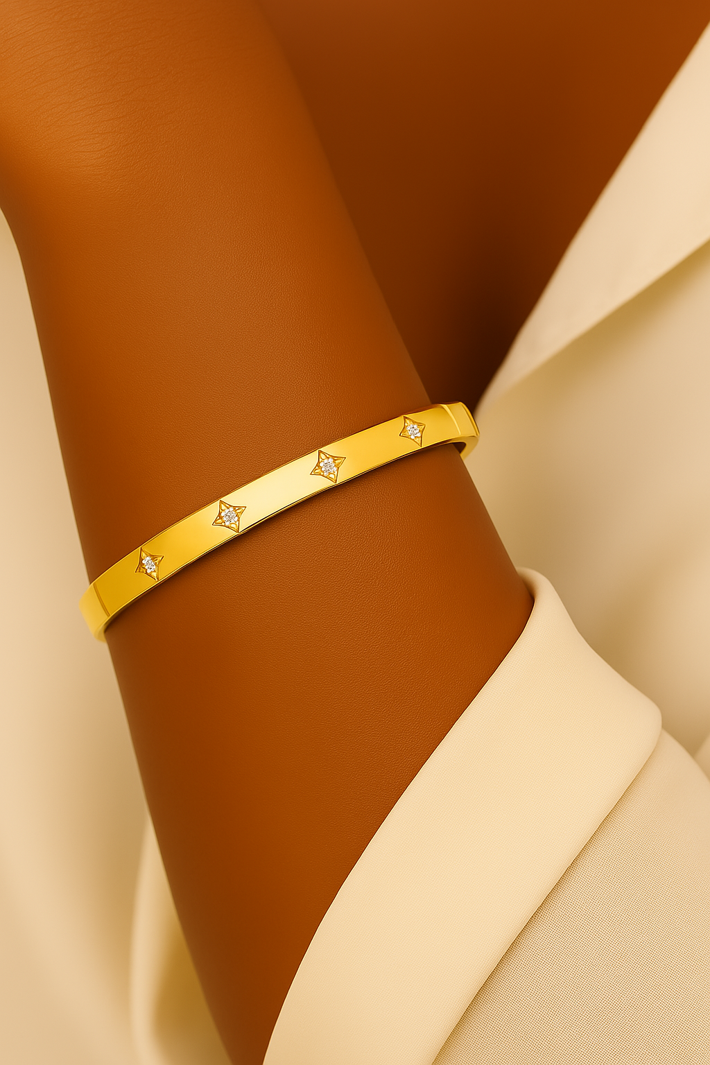 MIKA BANGLE Sencillez que impacta. La MIKA Bangle está elaborada en acero inoxidable con baño en oro de 18k, diseñada para quienes valoran la elegancia sin esfuerzo. Su forma rígida y minimalista se adapta con comodidad, mientras que su acabado pulido refleja una estética limpia y moderna.