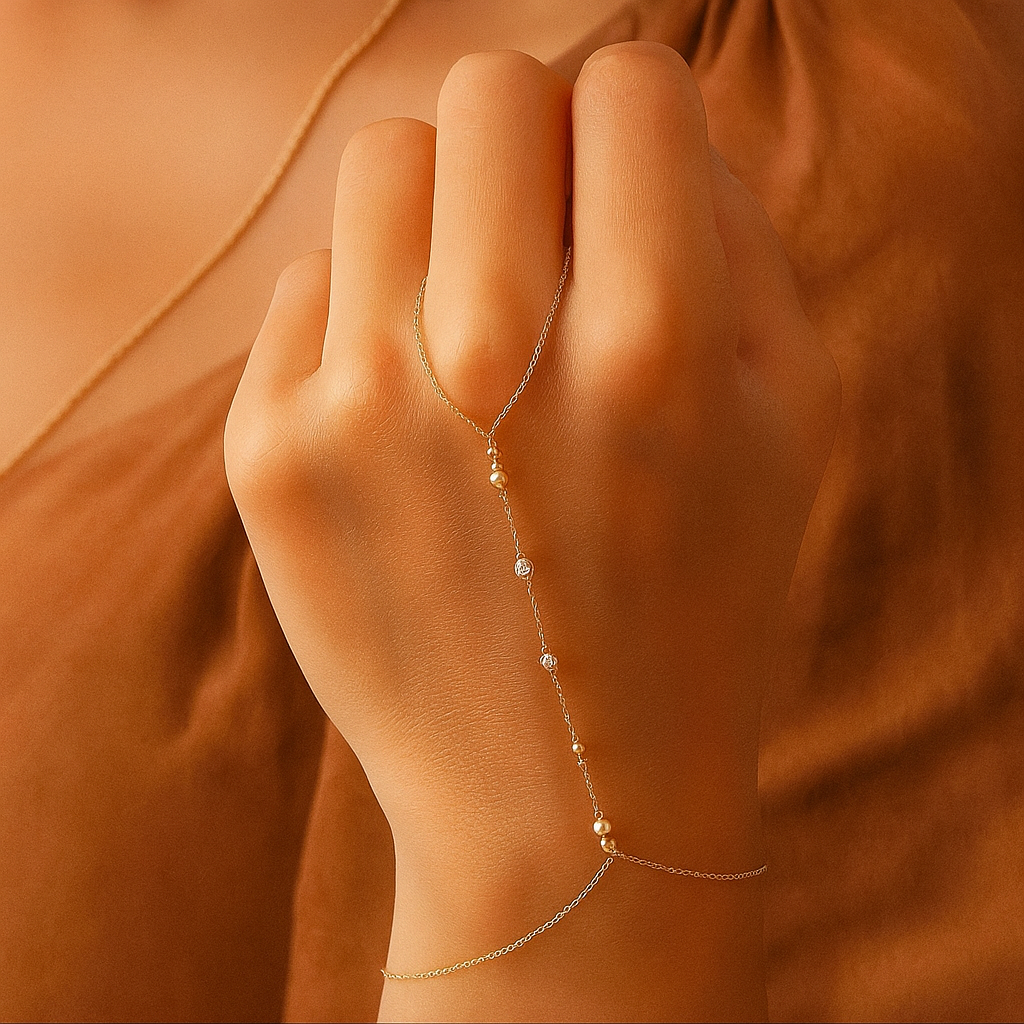 La delicadeza se transforma en arte con el Serenidad Hand Chain. Esta cadena de mano en tono dorado fluye con elegancia desde la muñeca hasta el dedo, creando una conexión visual serena y sofisticada. Adornada con pequeñas cuentas brillantes y gemas estratégicamente colocadas, cada detalle refleja luz con sutileza y encanto.