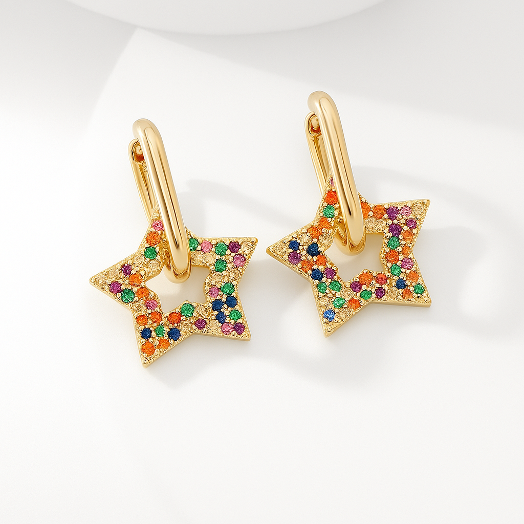 Star Earring Un diseño que captura la energía del color y la forma con elegancia. Estos aretes en forma de estrella están elaborados en tono dorado y decorados con piedras multicolores que aportan un brillo sutil y alegre. Su estructura hueca y ligera los hace cómodos de llevar, mientras que el cierre de gancho asegura un ajuste práctico y seguro. Perfectos para quienes buscan una pieza llamativa pero refinada, estos aretes añaden un toque de personalidad a cualquier atuendo, desde lo casual hasta lo festivo.